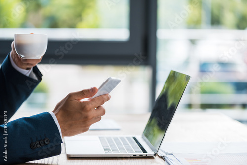 cropped view of man holding cup of coffee and smartphone near laptop