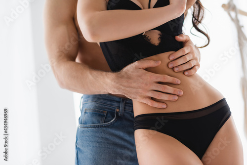 Cropped view of muscular man hugging waist of sexy woman in lingerie