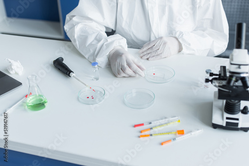 Cropped view of scientist in hazmat suit holding glass near petri dishes and microscope in lab.