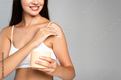 Cropped view of smiling woman holding jar and applying cream on shoulder isolated on grey