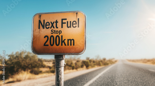 Cross the Australian outback. Next fuel stop sign 200km ahead isolated on white background