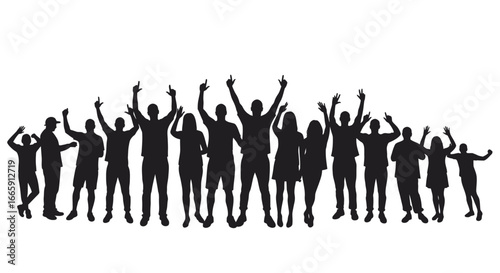 crowd, people, celebration, cheering, success, group, party, event, audience, concert, festival, silhouette, black, white, vector, illustration, team, teamwork, achievement, joy, happy, excited, fan, support, winner, winning, together, oneness, community, lifestyle, isolated, design, graphic, art, creative, modern, artistic, professional