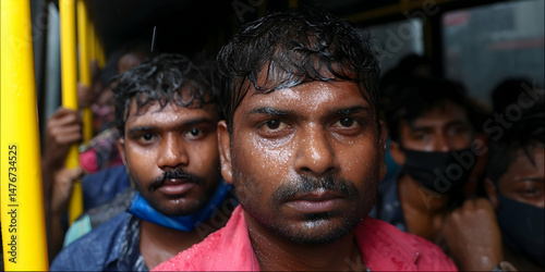 Crowded bus during heavy rain showcasing struggles and resilience of urban commuters in the heart of the city