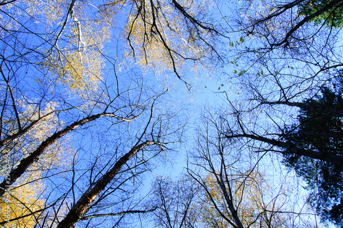 Crowns of trees in a forest in autumn against a blue sky. View from below.