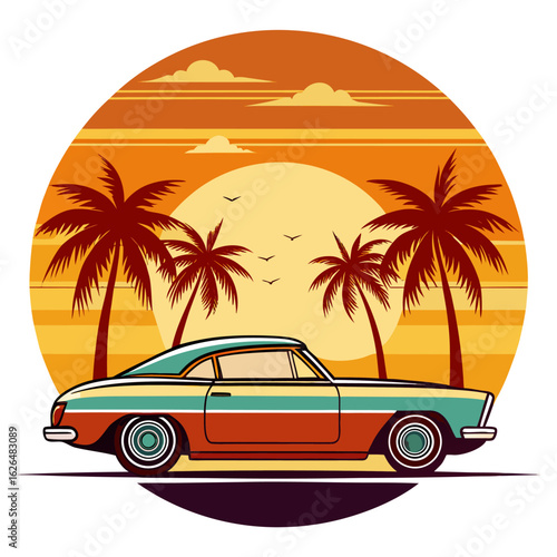 Cruise & Palms Half-Sun – A classic car and palms set against a gradient sunset, framed in a half-circle retro style.