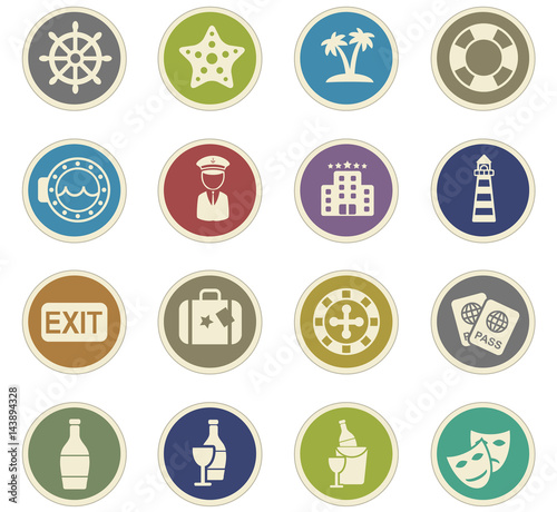 icon, symbol, element, design, vector, steering wheel, starfish, palm tree, lifebuoy, captain, cruise, hotel, beacon, exit, suitcase, roulette, passport, champaign, bottle, glasses, bucket, mask