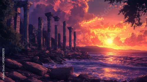 Crumbling columns backlit by a dramatic sunset vivid colors illuminating ancient ruins