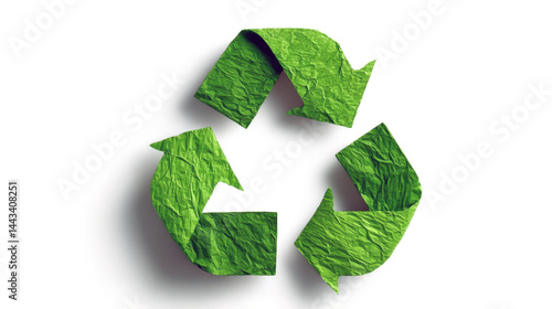 Crumpled green paper forming universal recycling symbol, representing environmental consciousness against pristine white backdrop
