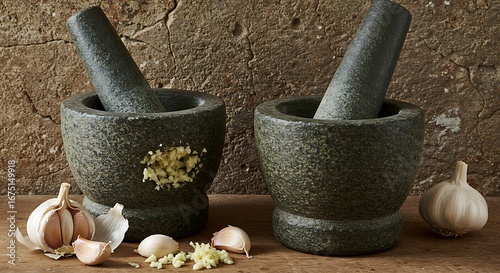 Crushed garlic ready for cooking in stone mortar and pestle