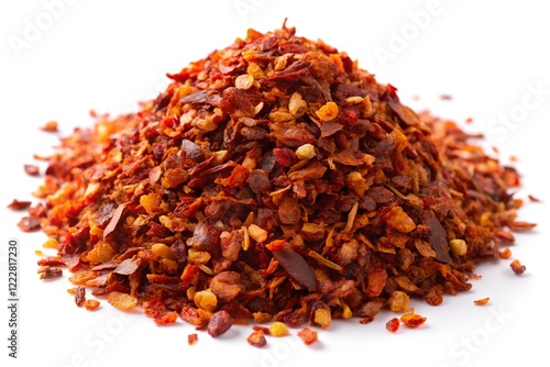 Crushed red chili pepper flakes texture on white background used as a spicy ingredient in various dishes culinary flavor enhancer