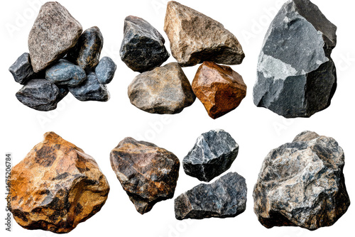 Crushed rocks in various sizes and colors displayed on a transparent background showcasing natural textures and patterns