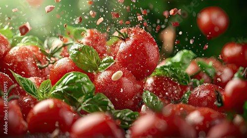 Crushed tomato exploding on fabric or wall in a wild close-up, copy space above