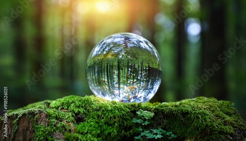 Crystal ball on mossy tree stump in forest, abstract natural background. magic prediction crystal ball for meditation, relax. esoteric spiritual practice. Witchcraft, ritual for summoning spirits