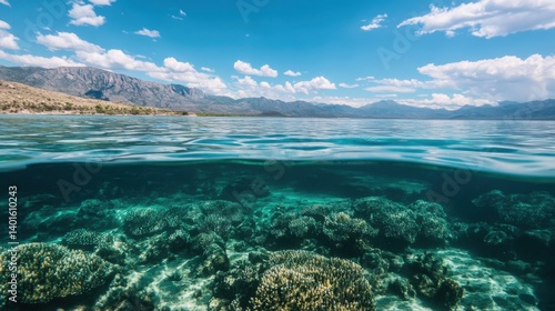 Crystal clear waters reveal stunning coral reefs teeming with marine life beneath the surface in a beautiful coastal landscape. Bright blue skies complement the serene atmosphere