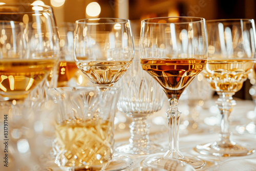 Crystal glasses filled with golden drinks, creating a luxurious and festive ambiance.