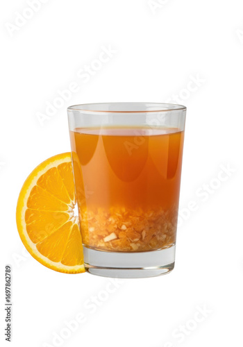 Crystal-clear tumbler with vibrant amber-orange fruit juice, distinct pulp layer, and sliced orange wheel against seamless transparent background, concept of natural juice purity and freshness