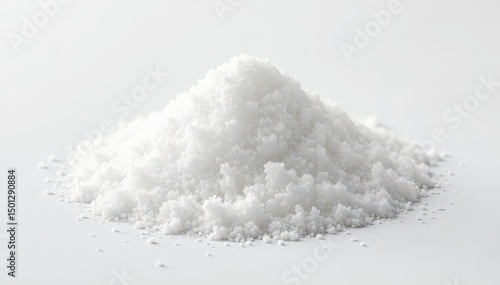 Crystalline sugar granules, bright white background, scoop, isolated, sweet