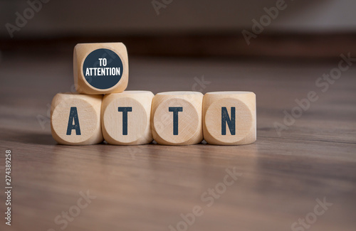 Cubes and dice with ATTN to attention on wooden background