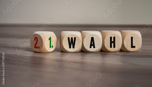 Cubes, dice or blocks with first and second choice and the german translation erste wahl und zweite wahl on wooden background
