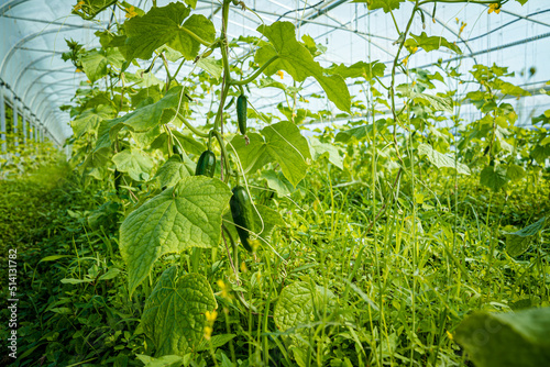 Cucumber plant in greenhouse. Pickle. Vegetable food