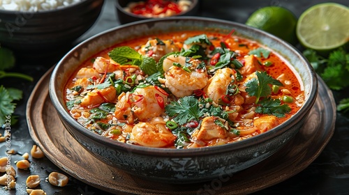 Cuisine Authentic Thai curry served in a traditional bowl with jasmine rice, fresh herbs, and spicy condiments, showcasing bold flavors and culinary expertise. Illustration, Minimalism,