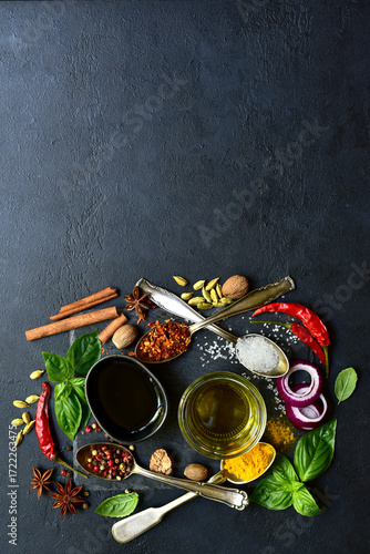 Culinary background with spicies . Top view with copy space.