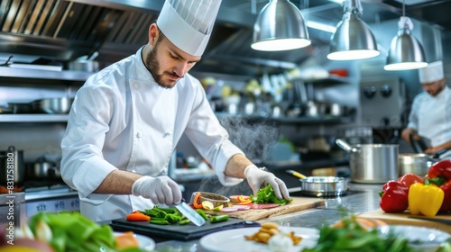 Culinary Entrepreneurship: Chef cooking in a professional kitchen with fresh ingredients