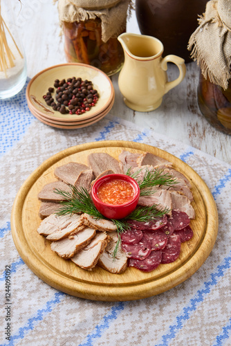 meat, assortment, veal, tongue, culinary, presentation, rustic, charme, platter, dill, wooden, board, photo, art, lighting, composition, contrast, colours, palette, texture, delicious, cookery, delicacy, arrangement, slice, peppercorn, mustard, sauce, garnished, fresh, epicure, traditional, setting, table, savoury, appetiser, style, elegant, aesthetic, close, up, detail, artisan