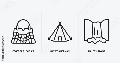 culture outline icons set. culture icons such as crocodile leather bag, native american wigwam, maletsunyane vector. can be used web and mobile.