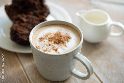 Cup of cappuccino coffee served with coffee creamer and chocolate cake on wooden table
