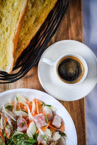 hot drink, cup of coffee, bread, tahiti, french polynesia, meal, breakfast, raw fish, fish