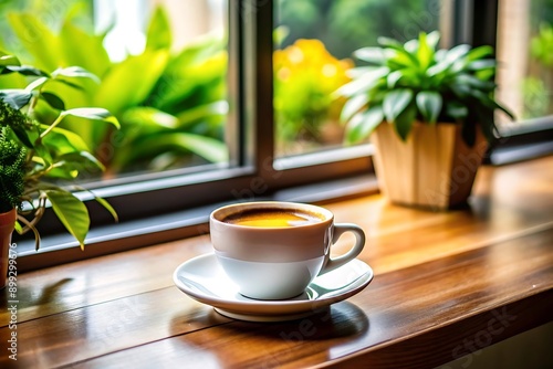 hot drink, cup, mug, window, view, green, plant, nature, foliage, morning, sunlight, cafes, cafes, relaxing, drink, beverage, hot drink, coffee break, coffee time, espresso, cappuccino, latte, tea, cup of tea, teacup, saucer, wooden table, table, wood, window sill, home, interior, kitchen, dining room, cosy, peaceful, tranquil, calm, warm, inviting, refreshment, breakfast, lifestyle, relaxation