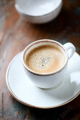 Cup of coffee on rustic wooden background. Close up.