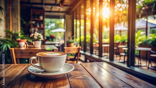 Cup of coffee on wooden table in cozy cafe setting during morning
