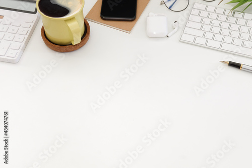 Cup of coffee, smart phone, calculator and wireless keyboard on white office desk.