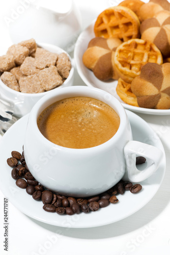 hot drink, espresso, beverage, food, breakfast, background, cookie, coffee bean, ingredient, cup, drink, fresh, sweet, dessert, caffeine, aroma, brown, concept, favor, aromatic, epicure, morning, arabica, black, traditional, ground, foam, white, closeup, italian, cafes, energy, froth, sugar, hot, space, bake, bakery, milk