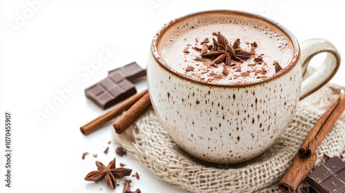 cup, hot, chocolate, cinnamon, white, background, beverage, drink, seasonal, sweet, treat, warming, cosy, indulgent, comforting, frothy, cocoa, festive, minimal, copy, space, text, sweet tooth, rich, creamy, soothing, winter, relaxing, delicious, warmth, simple