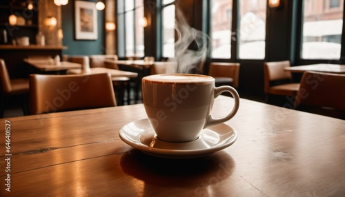 cup of hot coffee with cozy coffeehouse restaurant background, created using AI generative technology