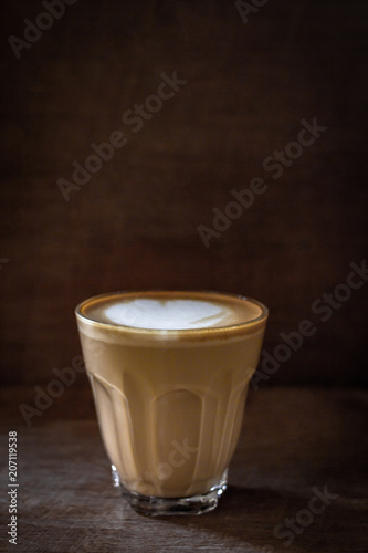 cup of hot coffee with foam and smoke on table in the morning. copyspace for your text