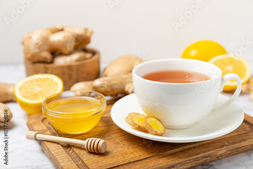 Cup of hot ginger tea with slices of ginger root on wooden background. Warming drink. Alternative medicine. Tea with honey, lemon, ginger and mint. Space for text. Copy space