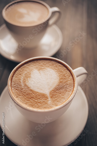 Cups of coffee with latte art on wooden background