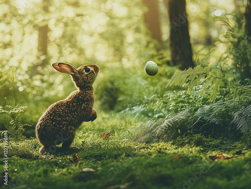 rabbit, forest, easter, spring, timberland, green, nature, egg, rabbit, wildlife, magical, floating, holiday, animal, cute, festive, wonder, discovery, fresh, hidden, peaceful, environment, sunlight, mystical, supernatural, curious, alert, enchanting, mysterious, surreal