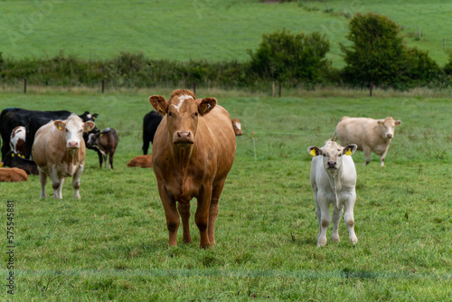 Curious cow and calf stand on a green grass pasture on a summer day. Cows on free grazing. Livestock farm. White and brown cow on green grass field