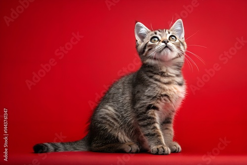 Curious Kitten on Red: A charming tabby kitten, eyes wide with curiosity, sits against a vibrant red background, gazing upwards with an air of playful inquisitiveness.