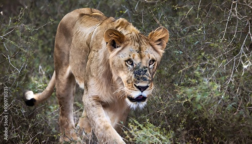 Curious Lion Exploring the Bush – A Lion Walks Through Dense Vegetation, His Nose Close to the Ground