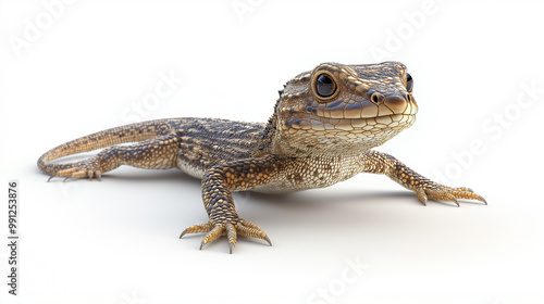 lizzard, reptile, animal, isolated, white background, looking up, curious, scale, wildlife, nature, brown, yellow, studio shot, one animal, half face, closeup, detail, herpetology, exotic, pet, wild, australia, australian, endemic, species, zoology, biological, fauna, unique, rare, reptilian, scaly