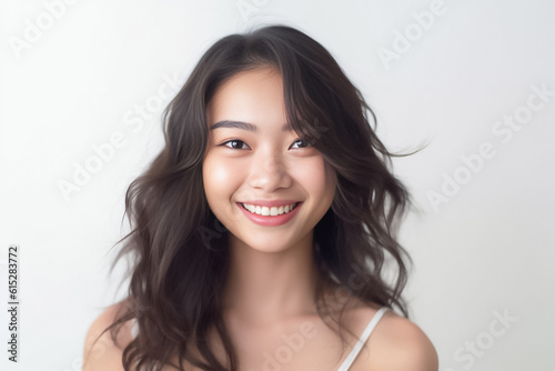 curly hair and an infectious smile, an Asian teenage girl showcases a positive vibe against a white backdrop. generative ai.