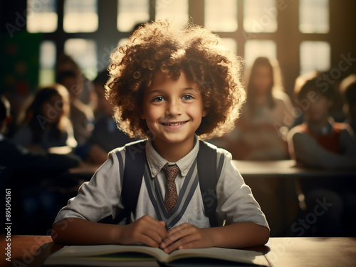 Curly-haired schoolboy smiling at his desk with classmates reading in the classroom