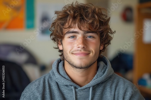 curlyhaired young man in a cozy dorm room wearing a grey hoodie and directly engaging the viewer with a warm smile capturing the essence of youth and personal space