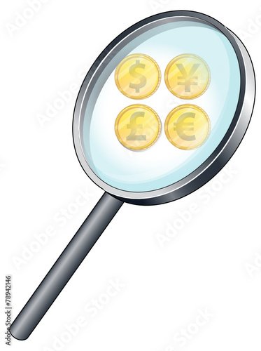 illustration, graphic, drawing, cartoon, picture, clip art, isolated, on white, white, white background, currency, zoom, enlarge, glasses, magnifying glass, dollar, yen, euro, pound, money, valuable, gold, medal, coin, rate, tool, device, economic, economy, business, saving, shiny, coin, marketing, vector